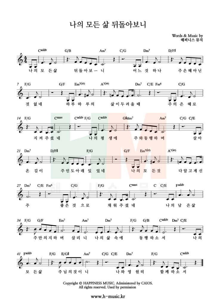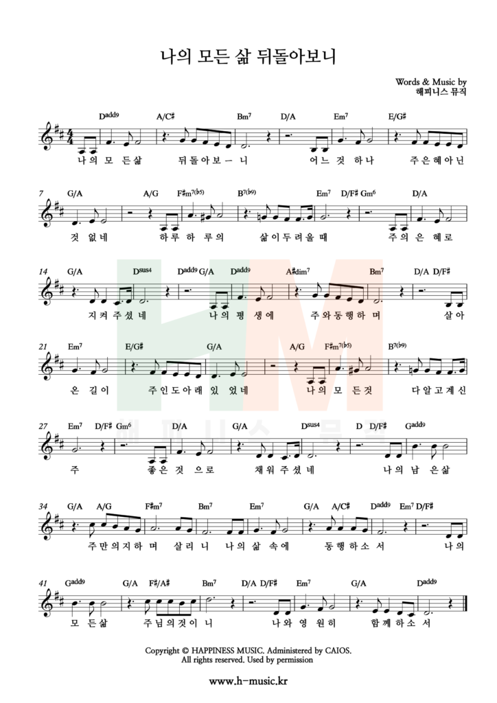 해피니스 뮤직의 첫번째 디지털 싱글 ‘나의 모든 삶 뒤돌아보니’는 지금까지 살아온 모든 삶은 주님의 은혜임을 고백하는 찬양입니다. 행복한 교회 표재근 담임 목사가 작사 · 작곡했으며, 이주원 뮤직 프로듀서가 편곡 · 믹싱 · 마스터링으로 참여한 해피니스 뮤직의 첫 앨범입니다.