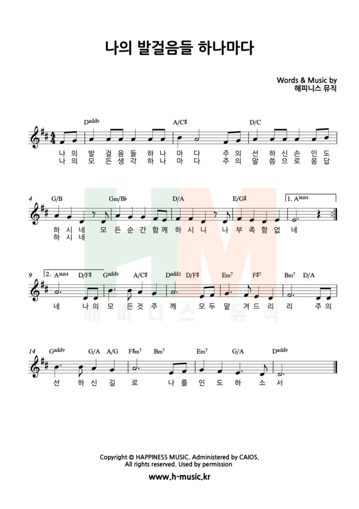 “나의 발걸음들 하나마다” 의 원 코드는 C이며, 찬양 인도자와 세션이 참고할 수 있도록 D코드 악보를 같이 올려드립니다.