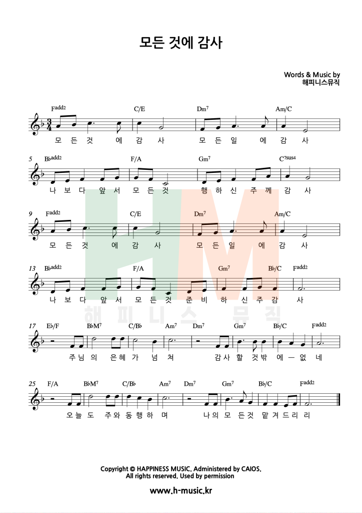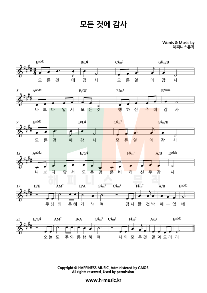 “모든 것에 감사” 찬양은 해피니스 뮤직의 창작곡이며, 아직 발매되지 않은 곡입니다.