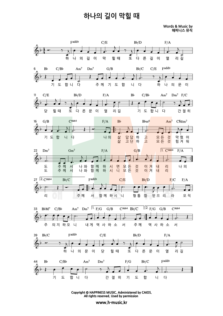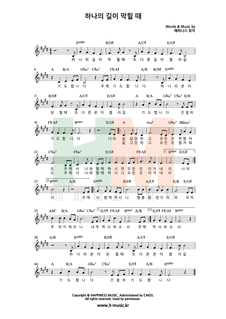 “하나의 길이 막힐 때” 찬양은 해피니스 뮤직의 창작곡이며, 아직 발매되지 않은 곡입니다.