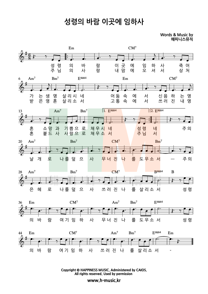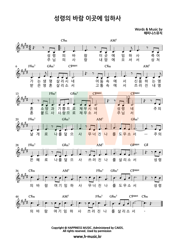 “성령의 바람 이곳에 임하사” 찬양은 해피니스 뮤직의 창작곡이며, 아직 발매되지 않은 곡입니다.